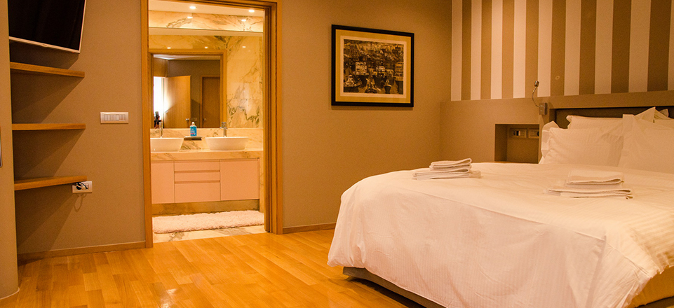 Στον ισόγειο όροφο, βρίσκεται ένα deluxe double-bedroom και ένα single-bedroom με πλήρως εξοπλισμένο γραφείο και ανεξάρτητο μπάνιο. Στον ίδιο όροφο υπάρχει και χώρος γυμναστηρίου, κατάλληλα εξοπλισμένος για να παρέχει στον επισκέπτη τη δυνατότητα να συνδυάσει τη διαμονή του με στιγμές εκτόνωσης και ψυχικής ευεξίας.